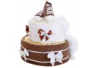 Dvoupatrový čokoládový plenkový dort o průměru 27cm obsahuje 55 kusů jednorázových plen Pampers, flanelovou osušku, dětskou deku a botičky capáčky.