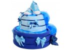 Světle modrý dortík z plenek pro chlapečky má průměr 27cm a obsahuje 55 kusů jednorázových plen Pampers, flanelovou osušku, dětskou deku a botičky capáčky.