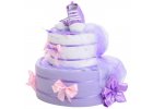 Fialový plenkový dortík pro male princezny má průměr 27cm a obsahuje 55 kusů jednorázových plen Pampers, flanelovou osušku, dětskou deku a botičky capáčky.