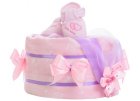 Růžový plenkový dortík pro malé princezny z plenek má průměr 18cm a obsahuje 20 kusů jednorázových plen Pampers, flanelovou osušku a botičky capáčky.