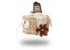 Čokoládový plenkový dortík z dětských plen pro chlapečky má průměr 18cm a obsahuje 20 kusů jednorázových plen Pampers, flanelovou osušku a botičky capáčky.