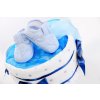 Tmavě modrý plenkový dortík z dětských plen pro chlapečky má průměr 18cm a obsahuje 20 kusů jednorázových plen Pampers, flanelovou osušku a botičky capáčky.