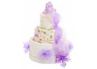 Růžový, jednopatrový plenkový dort obsahuje 25 kusů jednorázových plen Pampers, 2 kusy bavlněných látkových plen, bavlněnou osušku a botičky capáčky.